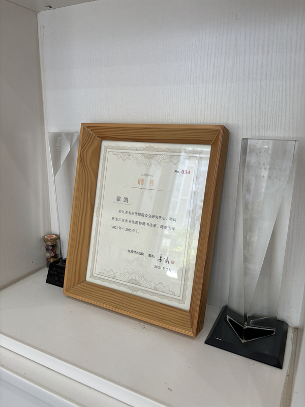 2015年,機(jī)緣巧合下,他結(jié)識(shí)了徐州市書法家協(xié)會(huì)副主席單曉光。就在他決意拜其為師時(shí),卻遭到了回絕?!暗谝谎劭吹阶髌防蠋熡X得不滿意,直到看了我寫字的狀態(tài)、對(duì)書法的執(zhí)著才慢慢同意了。”有了師父,張凱發(fā)奮地求學(xué),觸及書法的“靈魂”?!耙彩前輲熀?,我的字才有了法度,書法水平得到明顯的提升?!奔妓嚨倪M(jìn)步直接體現(xiàn)在個(gè)人榮譽(yù)墻上。