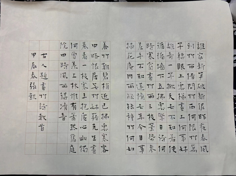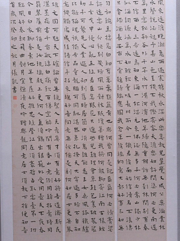 “規(guī)模大、等級(jí)高,意味著競爭就大?!钡鎸?duì)“大考”,張凱習(xí)慣以平常心沉著應(yīng)對(duì)。他說,“寫什么內(nèi)容、選擇什么字體需要好好琢磨。到了后期創(chuàng)作,反而是最輕松、愉悅的時(shí)刻?!睋?jù)他回憶,某天晚上吃完飯回到工作室,他便執(zhí)起筆“說寫就寫”,4個(gè)多小時(shí)全神貫注、心無旁騖、一氣呵成,完整寫就楷書千字詩文。